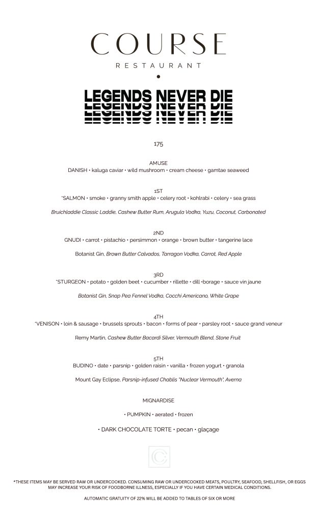 We’re turning up the volume at COURSE with a bold, one-night-only collaboration. Join us for the Legends Never Die Cocktail Dinner, a 5-course fall tasting menu by Chef Cory Oppold paired with inventive, high-energy cocktails from the crew at Legends Never Die — all for $175 per guest.